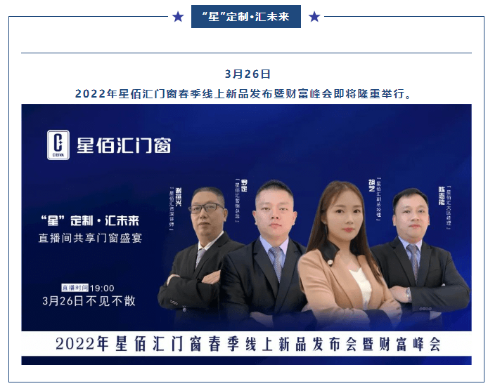 为响应国家疫情防控期间有关会议管理的要求,本次财富峰会选用线上模式举行,诚邀各地的经销商朋友们拨冗与会,期待与您共商星佰汇2022年度合作发展大计。届时,来自全国各地的星佰汇家人将齐聚云端,共同享受这场集视觉冲击力、思想感染力、形象召唤力于一体的门窗行业饕餮盛宴!
