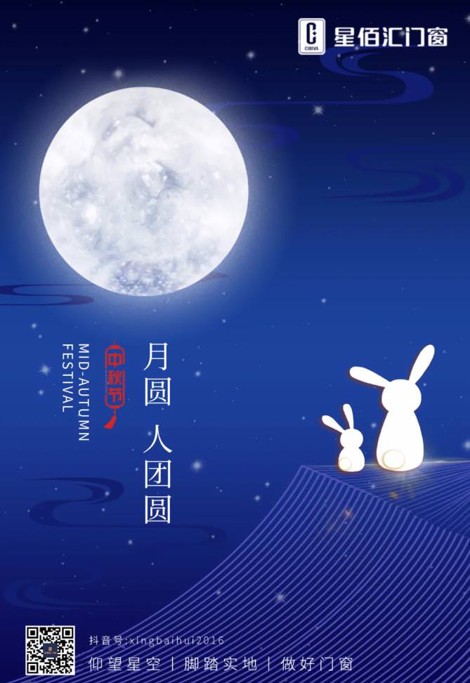 情满中秋,值此佳节之际,星佰汇门窗全体员工在此恭祝大家:中秋快乐!阖家幸福!